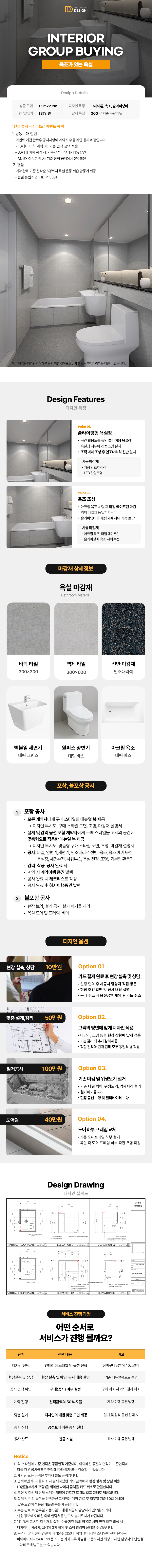 가성비 높은 타일을 활용하여 디자인한 욕조가 있는 욕실 타입입니다. 바닥의 타일은 300×300, 벽은 300×600 크기의 타일을 사용하였고, 욕조의 에이프런을 벽체 타일로 마감하여 욕조로 인해 벽면의 느낌이 단절되지 않도록 디자인하였습니다. 유지관리가 용이한 그레이톤 타일을 사용하였고, 차가운 이미지를 중화하기 위해 웜톤의 칩이 있는 인조대리석을 사용했습니다. 조적으로 조성한 욕실 하부 선반과 브랜드 위생도기 등 깔끔하고 정돈된 느낌의 디자인을 원하신다면 이 타입을 선택하시면 후회가 없으실 겁니다. ※ 공사 예산은 셀프견적에서 공간의 면적과 옵션을 선택하여 확인해 주시면 됩니다. ※ 디자인 상담 및 현장 실측은 구매하신 순서대로 진행됩니다.